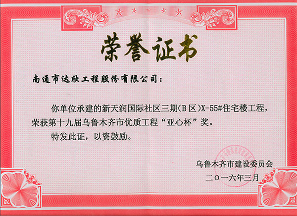 另訊,由我工程公司承建的新天潤國際社區三期(B區)X-55#住宅樓工程,榮獲第十九屆烏魯木齊市優質工程“亞心杯”獎。