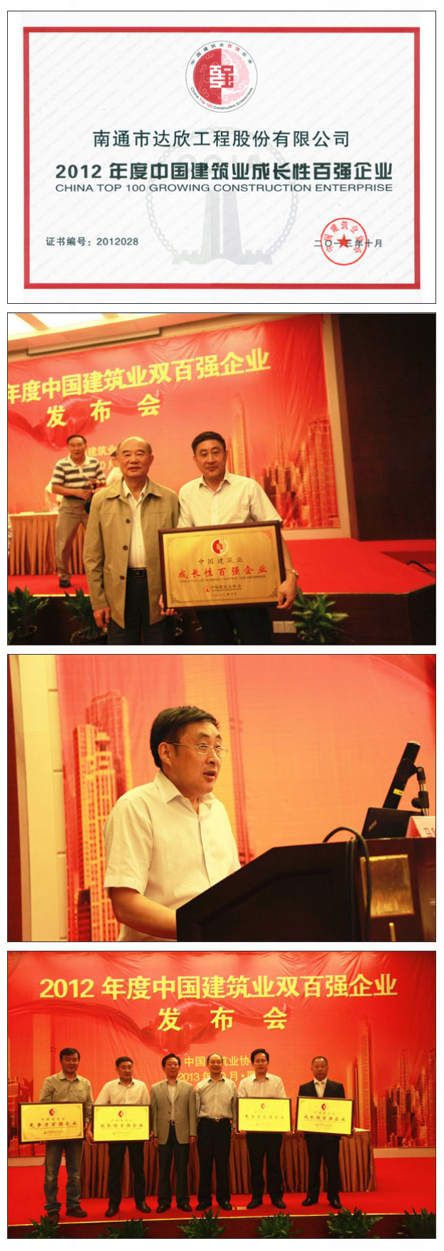 會議發布了2012年度中國建筑業雙百強企業,南通市達欣工程股份有限公司再次入選成長性百強企業(綜合排名位列第28名,比去年排名提高了21位);會議向2012年度中國建筑業雙百強企業頒發牌證,我公司作為獲獎企業代表上臺領取獎牌;會議還同時進行了中國建筑業雙百強企業代表經驗交流,公司董事長馬和軍作為江蘇地區代表、作為成長性百強企業代表在會上作了“砥礪奮進,拼搏進取,實現企業新跨越”的經驗交流。