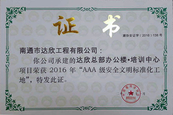 近幾年我公司獲得全國AAA級安全文明標準化工地23項,創建面涉及上海、江蘇、河北、黑龍江、湖南、新疆等市場,榮譽的取得為進一步提升達欣在全國各個市場的影響力,促進企業健康發展奠定堅實的品牌基礎。