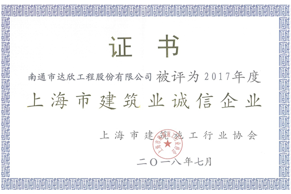 此外,公司還被評為2017年度上海市建筑施工企業綜合實力進步獎稱號。