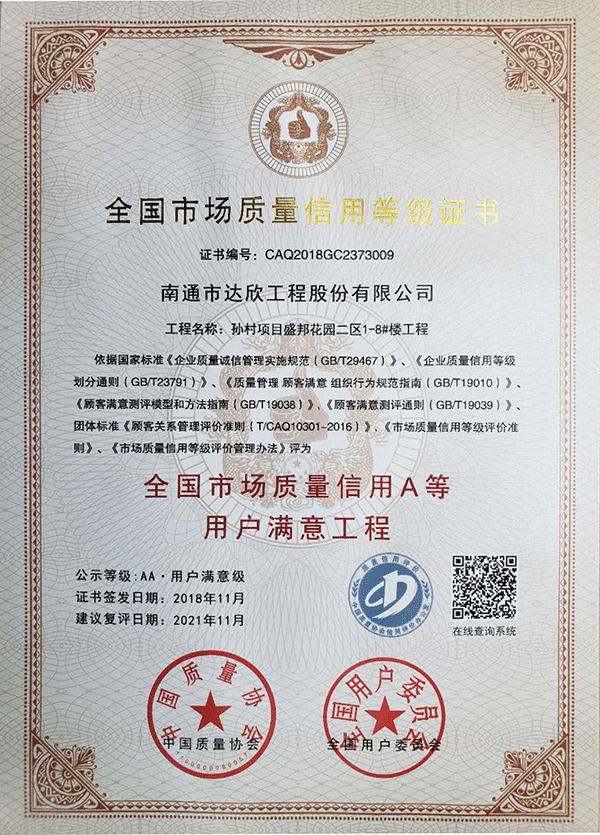 12月18日,由中國質量協會、全國用戶委員會聯合主辦的“2018滿意中國年會”在??谡匍_。由達欣集團第四工程公司承建的孫村項目盛邦花園二區1-8號樓工程榮獲“2018全國市場質量信用A等用戶滿意工程”。