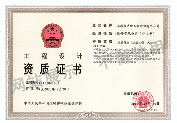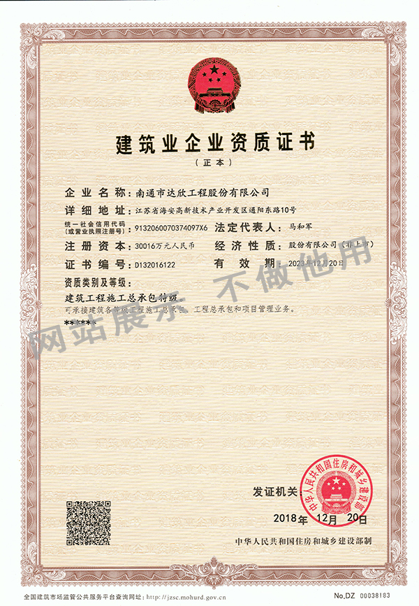 2018年12月26日,中國住房和城鄉建設部官網發布《關于核準2018年度第十批建筑工程企業資質名單的公告》(中華人民共和國住房和城鄉建設部公告2018年第328號),批準南通市達欣工程股份有限公司成功晉升建筑工程施工總承包特級資質,同時獲得建筑行業(建筑工程、人防工程)甲級設計資質。