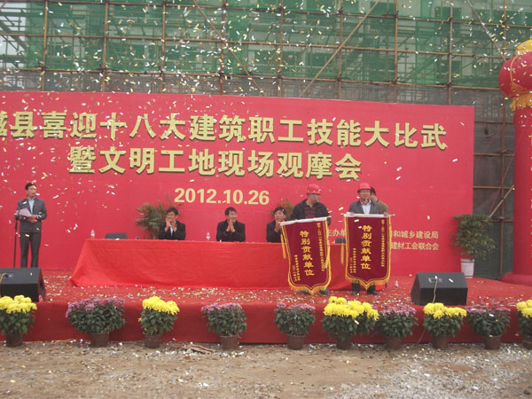 10月26日,由磁縣住房和城鄉建設局主辦,磁縣建筑建材工會聯合會承辦的“磁縣喜迎十八大建筑職工技能比武大會暨文明工地現場觀摩會”在寶盛世紀B區二期項目現場隆重舉行。邯鄲市住房和城鄉建設局建管處處長袁中英、邯鄲市建管辦主任邢文革、磁縣副縣長高強、磁縣住建局副局長趙志彬、馮保民、張彥華等領導出席開幕儀式,第四工程公司邯鄲項目總指揮陳仁富陪同出席。