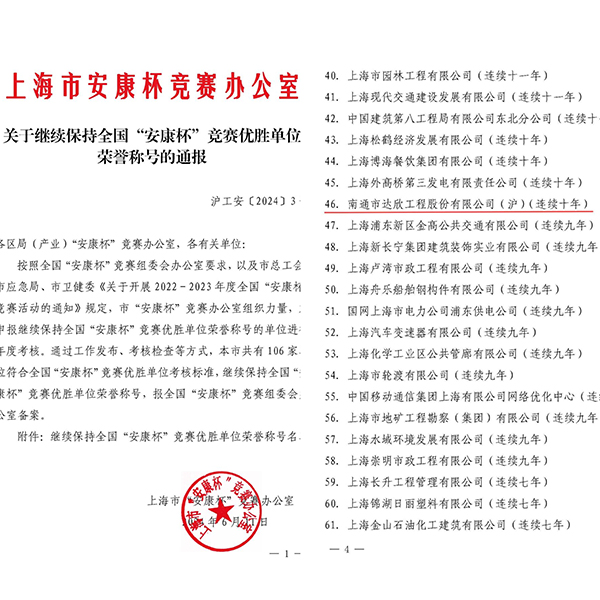 日前,上海市“安康杯”競賽辦公室滬工安【2024】3號文件,對獲得2022-2023年全國“安康杯”競賽優勝單位榮譽的集體進行通報,達欣集團連續十年被評為全國“安康杯”競賽優勝單位。