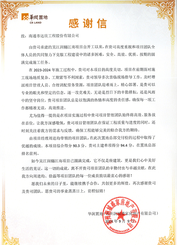 近日,公司收到華潤置地發來的感謝信,信中對集團第一工程公司承建的吳江潤樾江南項目在施工過程中攻堅克難,嚴把安全生產關,促進項目履約,為華潤置地高質量發展作出的貢獻表示感謝。