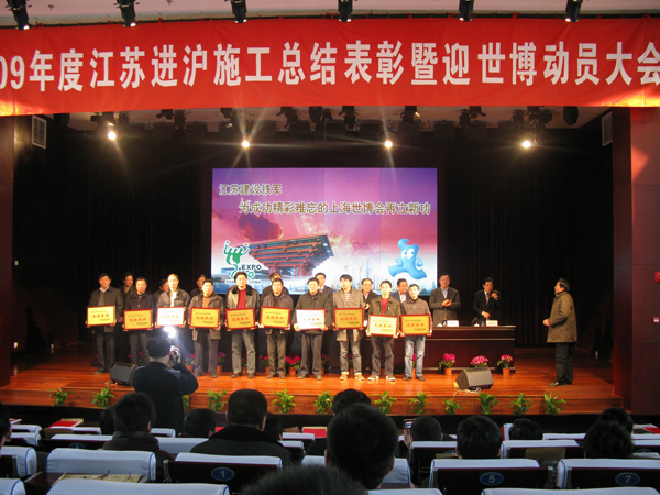 三月十日,江蘇省人民政府駐滬辦、江蘇省建筑工程管理局在上海隆重召開了2009年進滬施工總結表 彰大會,出席大會的有江蘇省建設廳副廳長、省建管局局長徐學軍、上海市建交委沈主任、建管辦曾主任 、上海市施工行業協會高秘書長、省人民政府駐滬辦陳主任、王處長等領導,會上對進滬施工先進企業、 先進個人進行了頒獎,我公司作為先進企業的代表上臺領獎,這是公司連續三年獲此榮譽。近幾年達欣公 司在強手如林的上海市場占得了一席之地,同時公司在上海開拓性的發展也得到了江蘇省、上海市建設主 管部門的充分肯定。